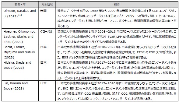 機関投資家のエンゲージメントが企業に与える影響について、学術論文の知見を確認してみましょう。エンゲージメントの重要性が高まるにつれ、国内外で多くの研究が蓄積されています。(図表3)