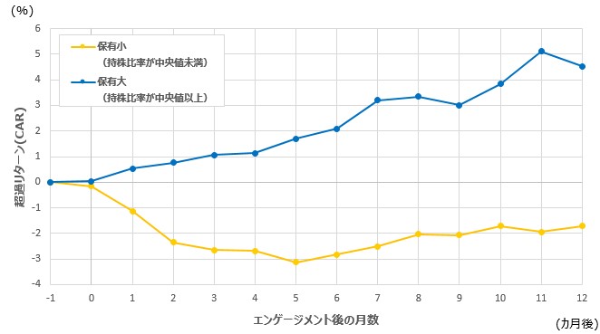 その結果、当社の保有が大きい企業群の方が、保有が小さい企業群より、エンゲージメント後の超過リターンが大きいことが明らかになりました。これは、アクティブ運用の観点から見ると、エンゲージメントが超過リターン獲得に大きく貢献していることを示しています。