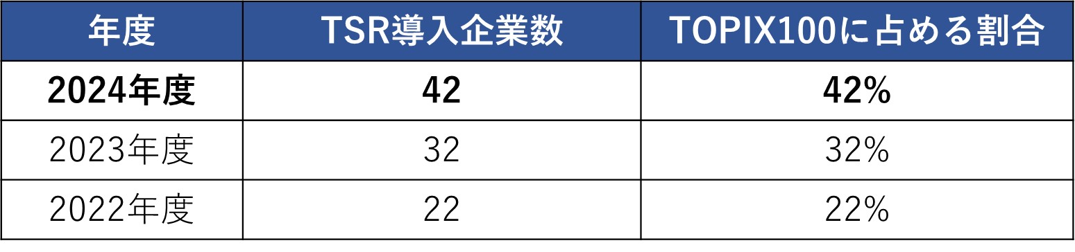 まず、経営陣と株主の利害共有を促す機運が高まる中、TOPIX100構成企業におけるTSR導入の割合は年々増加していることがわかります。直近では半数近い企業が導入しています。(表1)