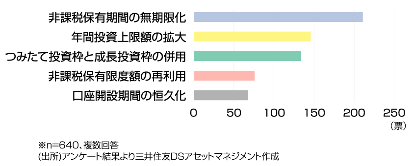 自由記入欄では、『旧NISAからロールオーバーをできるようにしてほしい』『売却後に限度額を即時回復させてほしい』『毎月分配型も対象にしてほしい』『現状満足しているので、後から制度を改悪しないでほしい』などがありました。