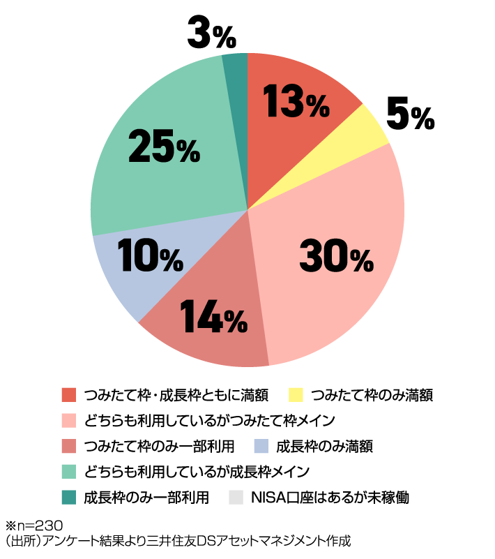 個人投資家アンケートでは『つみたて投資枠利用者』が58%、『成長投資枠使用者』が50%(『どちらも利用』は双方に加算)で、ややつみたて投資枠利用者が多い結果となっていました(図表13)。