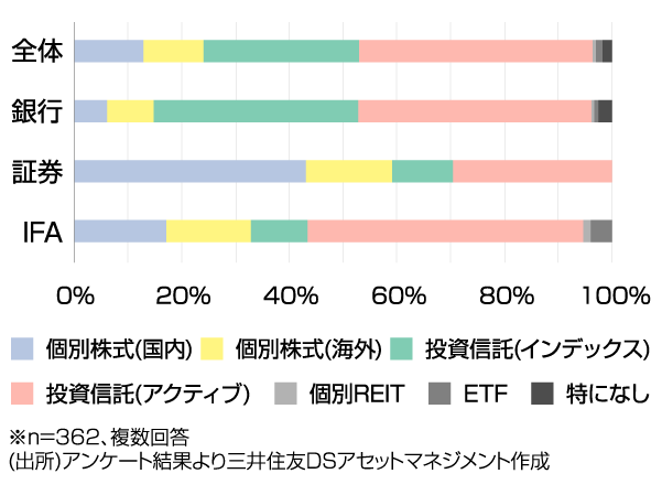 多くのお客さまが「静観」を選ばれていた、という回答でした。こちらは個人投資家アンケートでも同様の結果が出ており、大きな変動でも取り乱さず、比較的冷静に対応した方が多かったようです。また、下落局面で何かしらの投資行動を行った方々の割合を見てみると、売却した方はどの業態でも5%以下にとどまり、一方で追加投資や積み立ての増額を行った方々はどの業態でも売却をしたという回答より多くなりました。下落局面での追加の決断は勇気がいりますが、対面の金融機関では担当者のフォローのもと、きちんと買い増しができた方も多かったようです。