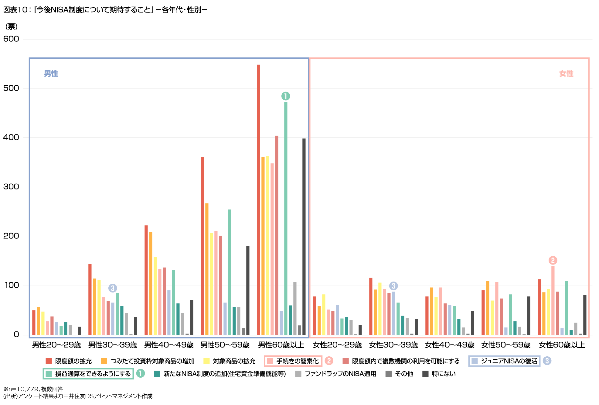 年代・性別ごとに別に見てみると(図表10)、投資経験が豊富と考えられる60代男性で『損益通算』への期待が大きい一方(①)、女性では『手続きの簡素化』が望まれているようです(②)。男女ともに30~40代、女性では20代でも『ジュニアNISAの復活』が望まれているのも、興味深い点かもしれません(③)。自分だけではなく次の世代のために、投資で資産を準備しておいてあげたいというニーズは強いようです。