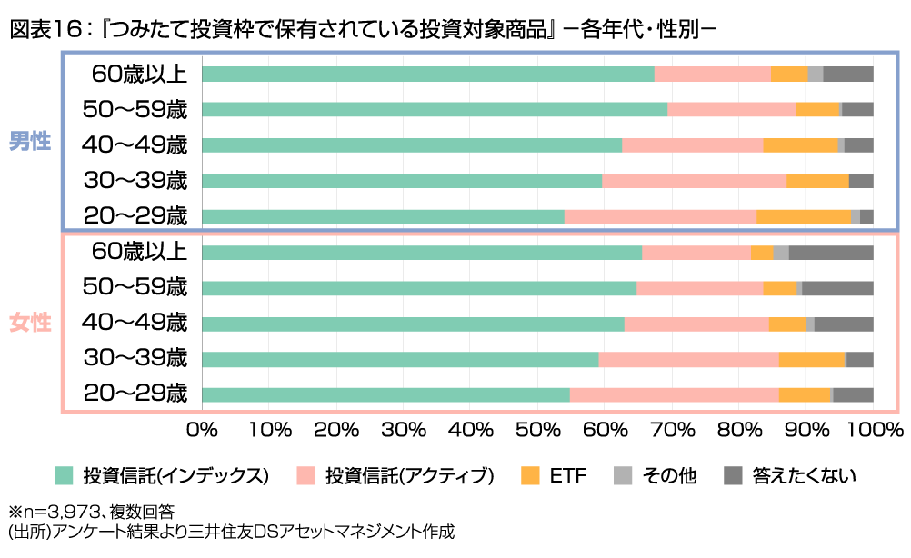 つみたて投資枠ではどの年代・性別でも現在はインデックス投資信託を保有している個人投資家が大多数でした(図表16)。資産は海外株式がほぼ1位ですが、男女ともに20代だけは国内株式の商品が1位となっています(図表17)。まだ投資経験が浅めの若い世代であり、身近な国内株式のインデックス投資信託を選ぶ傾向にあったのかもしれません。