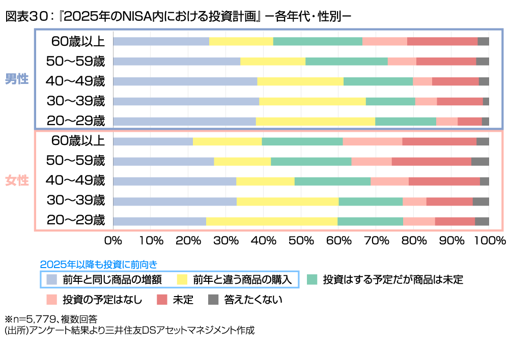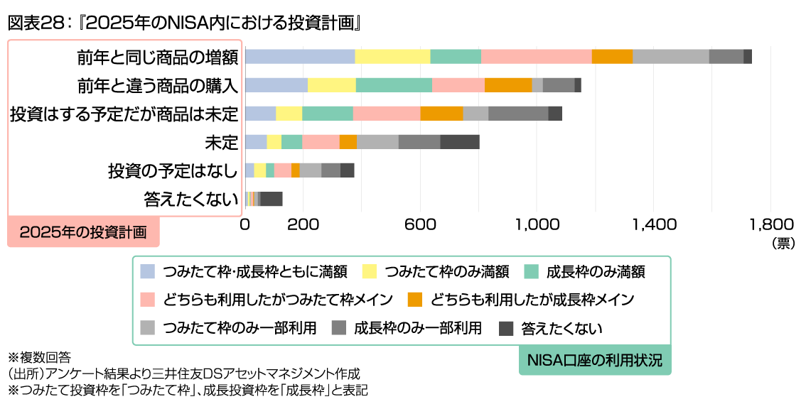 アンケート実施時点での『2025年のNISAにおける投資計画』についても見てみましょう。『前年と同じ商品の増額』が総数では多くなっていますが、これは個人投資家アンケートQ13でもあった通り『つみたて投資枠』利用者が現在の商品のつみたてを継続する予定だからと考えられます(図表28)。