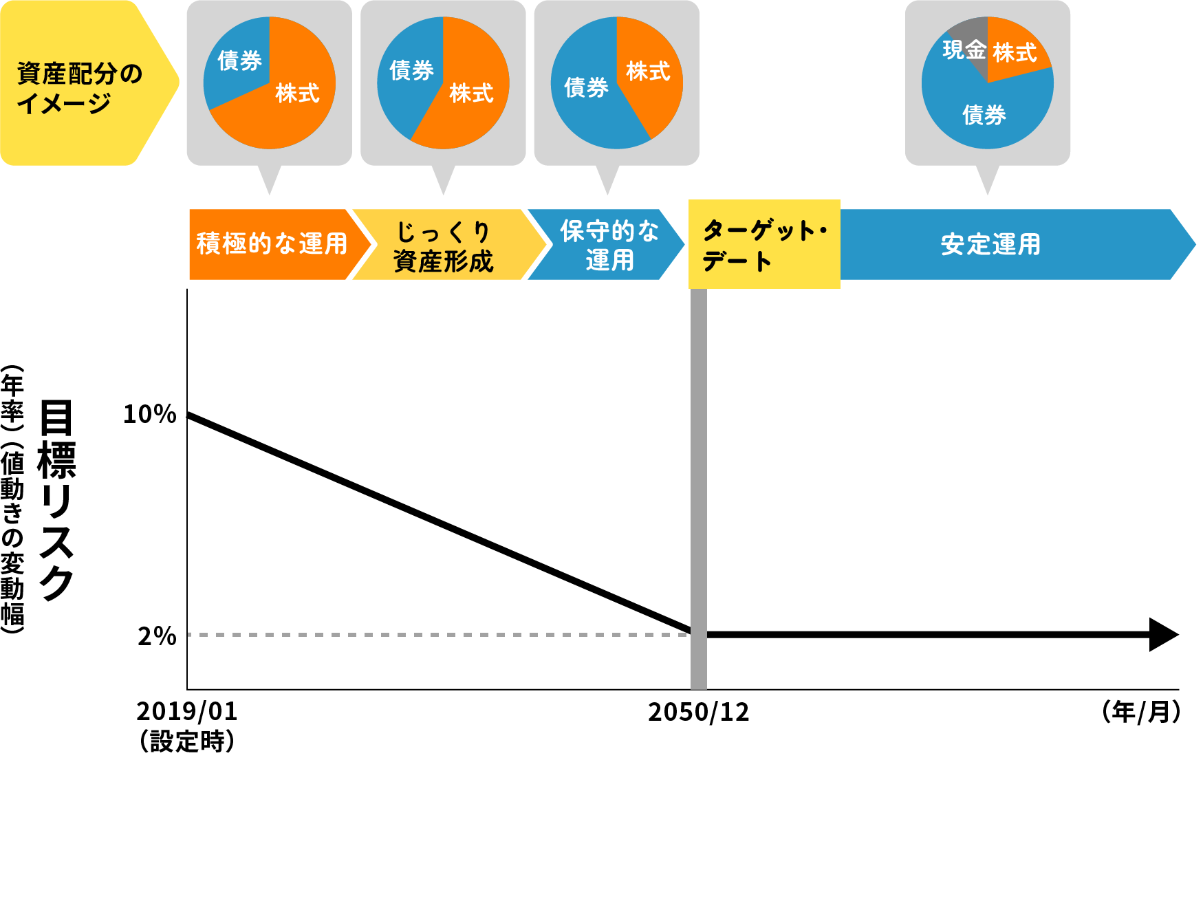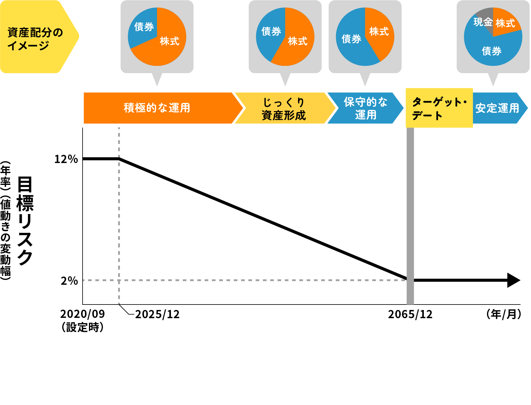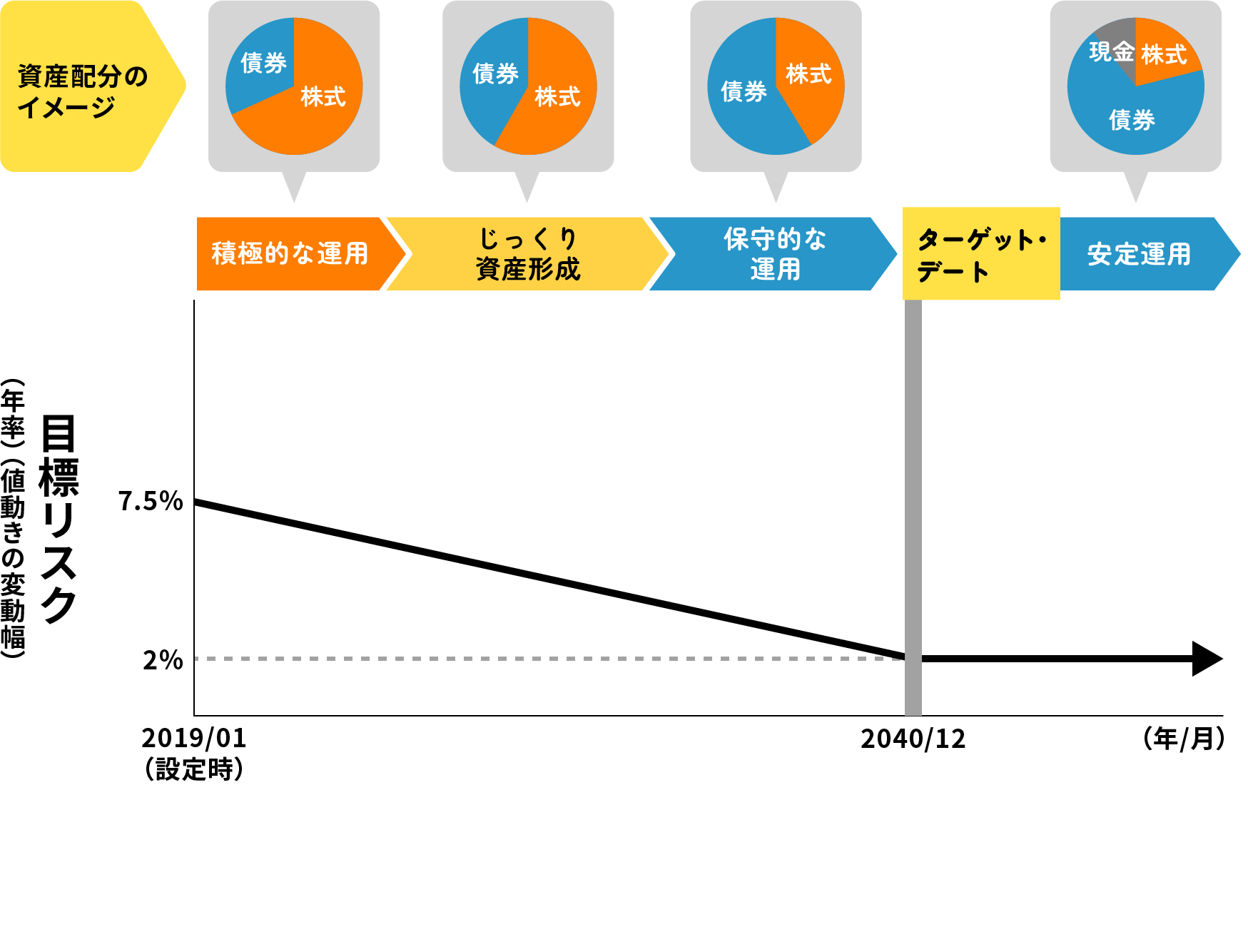 「ひとくふうターゲット・デート・ファンド」とは資産形成の目標となるターゲット・デート(退職時期など)に向けて、年齢に応じて最適な運用に切り替えていくファンドです。
