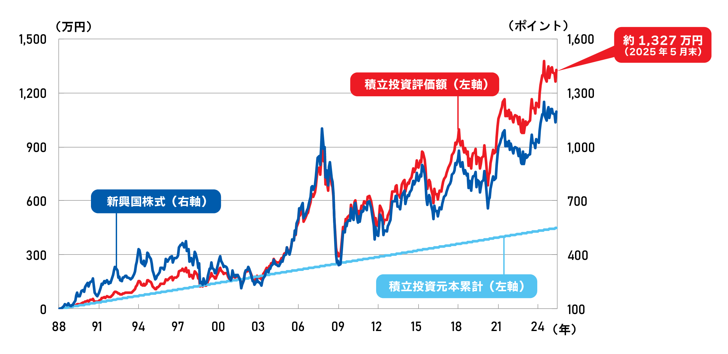 (MSCIエマージングを毎月1万円、円ベース。累計金額448万円[2025年5月末現在])