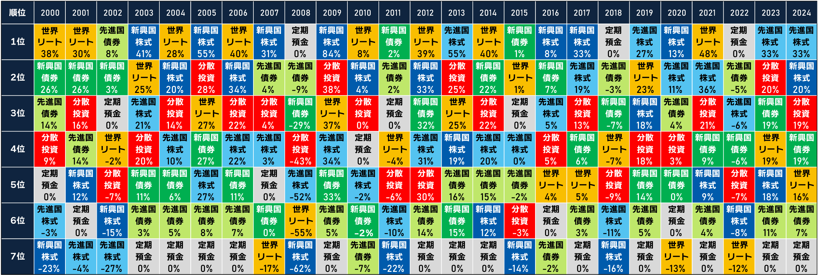 各資産と分散投資の年間リターン(円ベース)の順位(2000年~2024年)