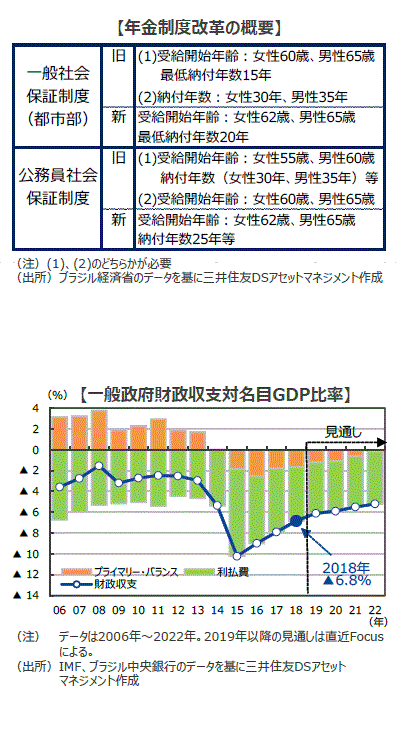 ■ブラジルの年金制度は過度に手厚いものだったことに加え、高齢化の進展もあり財政赤字の主因となっていました。年金改革は、まず2016年12月に当時のテメル政権が法案を議会に提出しましたが、反対が多く2017年に断念されました。その後、2018年の総選挙を経て発足したボルソナロ政権が、今年2月に新たに法案を議会に提出し、11月12日、年金改革法が成立しました。