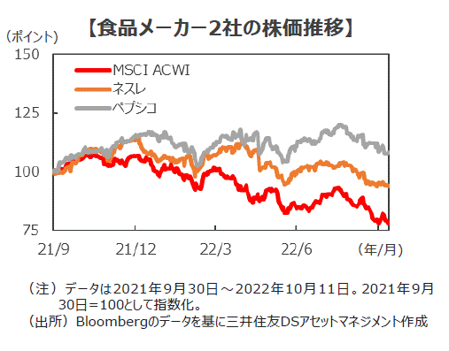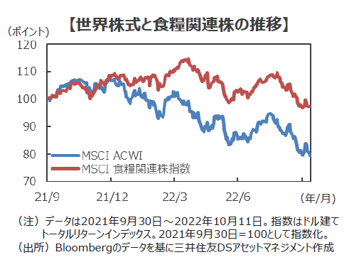 ■世界の株式市場の動きを示すMSCIオール・カントリー・ワールド・インデックス(MSCI ACWI)は、昨年の9月末以降の1年余りの間に▲20.4%下落しています。一方で、同期間の食糧関連株の代表的な指標であるMSCI ACWI・アグリカルチャー&フードチェーン・インデックス(MSCI 食糧関連株指数)は▲2.7%の小幅下落に留まっています。(騰落率はいずれも10月11日現在)