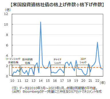 ■続いて格付けについて確認します。2022年は米国投資適格社債の格上げは多く、格上げ件数÷格下げ件数比率は2010年以降で2014年に次ぐ高水準を記録しました。多くの企業は、インフレ環境下で業績を伸ばし、信用力の改善に結びつけることができたと考えられます。しかし、2022年12月の同比率は1.4倍と平均である1.7倍を下回