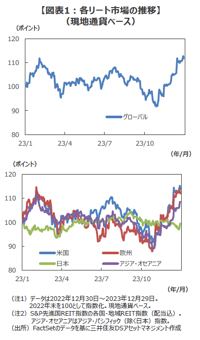 ■主要市場の米国市場は、コロナ禍を経たテレワークなどのオフィス外業務の更なる進展によりオフィス需要が停滞するなか、米連邦準備制度理事会(FRB)による利上げが続き、米長期金利が一時5%まで上昇したことを嫌気して、秋口にかけて弱含む展開となりました。その後は、インフレ圧力が和らぎ、24年のFRBの利下げ転換観測から長期金利が大きく低下する一方、経済の軟着陸(ソフトランディング)への期待感が高まり、大幅高となりました。