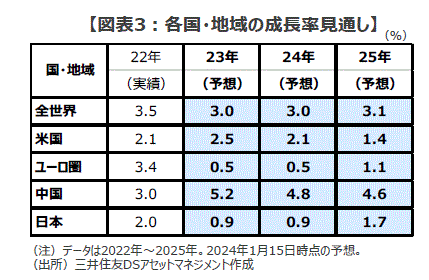 ■24年の投資環境は、リート市場にとって追い風となりそうです。インフレの減速を受けて、米欧をはじめとした世界の中央銀行が金融緩和姿勢に転換し、利下げ局面に入るとみられるためです。また、弊社は、24年の世界経済の成長率見通しを前年比+3.0%と、23年と同様に底堅く推移すると想定しています。
