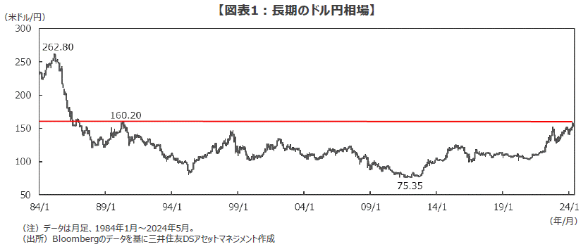 ■長期のドル円相場を振り返ると、1985年2月のプラザ合意を契機に始まった円高ドル安トレンドは、2011年10月に75円35銭をつけて終了し、その後のもみ合いを経て現在は反転途上にあります。こうした長期の視点から改めてドル円の現在位置を確認すると、ゴールデンウイークに政府・日銀が介入に踏み切った「160円」という水準は、チャート上とても重要な水準であったことに気づかされます。というのも、プラザ合意後の円高が短期間に猛烈なスピードで進んだことから、1990年4月につけた戻り高値の160円20銭を抜けると、プラザ合意前の262円80銭まで目ぼしいチャート上の節目がほとんど見当たらないのです(図表1)。