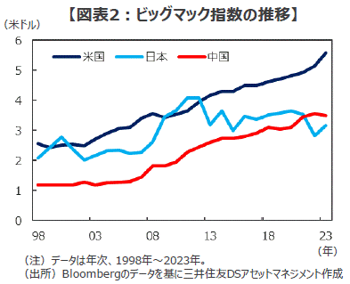 ■こうした「行き過ぎた円安」を示唆する指標は少なくありません。例えば、世界各国通貨の購買力を測る「ビッグマック指数(マクドナルド社の看板メニュー「ビッグマック」のドル建て価格を国際比較するもの)」を見ると、日本の同指数は3.17ドルで米国(5.58ドル)を大きく下回るばかりか、中国(3.50ドル)をも下回っています(いずれも2023年12月末時点)。