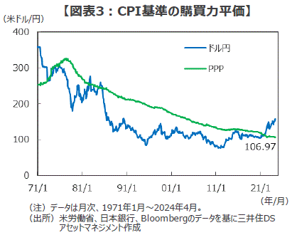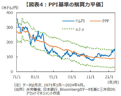 ■また、より広範なモノやサービスの価格をカバーする購買力平価(Purchasing Power Parity、PPP:2国間のインフレ格差から為替レートの適正水準を探る分析手法)で見ても、円の割安感は際立っています。具体的な数字で見てみましょう。足元のドル円レートは約156円(2024年6月5日時点)ですが、日米の消費者物価指数(CPI)の格差で計算したPPPは1ドル106円97銭、生産者物価指数(PPI)で計算したPPPは1ドル89円83銭となっています(図表3、4、いずれも4月末時点)。もし、CPI基準のPPPまでドル円が調整すると約49円(約31%)の大幅な円高に、PPI基準のPPPまで調整すると約66円(約42%)の「円急騰」が生じる計算になります。