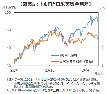 先般の大規模介入で当局が死守した1ドル160円という水準は、チャート的には「超円安」への流れを阻止する、ギリギリの防衛ラインと見ることができそうです。このため、短期的には市場と当局の「痺れる神経戦」が続くこととなりそうです。とはいえ、ファンダメンタルズから大きく乖離して見える現在の「行き過ぎた円安」は、その持続性に疑問があるだけでなく、その後の「円高シナリオ」の振れ幅を増幅する可能性があります。特に、日米の短期金利差が5%を下回ってくる局面では、為替市場でのボラティリティ上昇をきっかけに「思いがけない円高」が生じる可能性があるため、その動向には注意が必要でしょう。