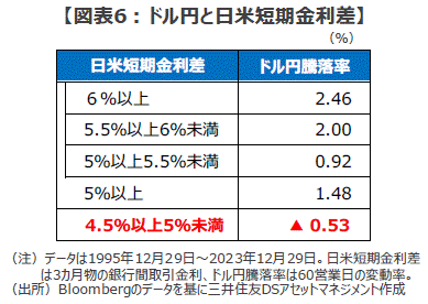 ■1995年12月末以降、約28年間のデータを見ると、日米の短期金利差(3カ月物の銀行間取引金利)が5%超の時期、ドル円の3カ月(60営業日)の騰落率は平均約1.48%のドル高となっています。また、より細かいレンジで見ると、金利差が拡大するほどドル高の傾向が強まります。しかし、同金利差が5%を下回り、4.5%以上5%未満のレンジに切り下がると、ドル円の騰落率は同約0.53%のドル安となっています(図表6)。