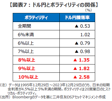 一方、同ボラティリティが6%以上の期間では同0.79%のドル安となります。こうした傾向は、ボラティリティの上昇とともに顕著になります。同ボラティリティが7%以上の期間は平均で0.98%のドル安、8%超で同1.35%のドル安、9%超で同1.82%のドル安、10%超では同2.58%のドル安と、為替の変動率はボラティリティの上昇につれてグイグイとドル安方向へと傾いていきます(図表7)。