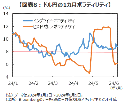 ■ちなみに、1カ月のヒストリカル・ボラティリティで8%という水準自体は、天災や戦争といった特別な材料がなかったとしても、平常運行の相場展開で普通につける水準といえそうです。また、市場で取引される通貨オプションが織り込む1カ月のインプライド・ボラティリティに至っては、今年の年明け以降殆どの期間で8%を上回って推移しています(図表8)。こうしてみると、日米の金融政策の変更により短期金利差が縮小してくると、上記の「円急騰」のトリガーがいつ引かれてもおかしくないでしょう。
