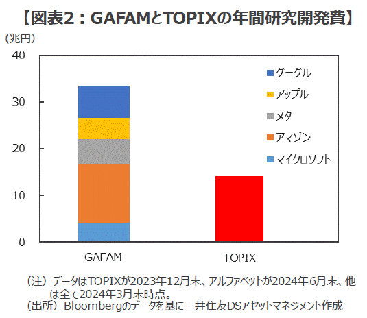 ■GAFAM5社の過去1年間の研究開発費(公表ベース)の合計は約2,290億米ドル(図表2、8月2日の為替レート1ドル146円換算で約33兆円)ですが、そのかなりの部分がAI開発投資だとされています。ちなみに、TOPIX採用企業2,135社の昨年度の研究開発費が総額で約14.2兆円ですから、GAFAMのAI開発投資が生半可ではないことがすぐにわかります。