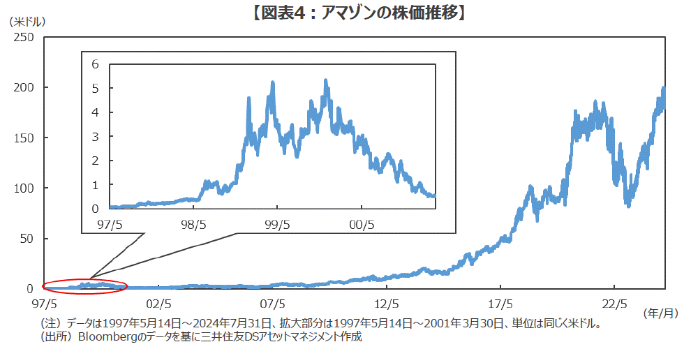 ■1997年5月に上場したアマゾンは、1990年代後半のネットバブルに乗り、99年12月には上場初値の約75.3倍に上昇しました。しかし、バブル崩壊後は大きく値を下げ、2001年10月にはバブル期の最高値の20分の1に暴落しました。このため、一時は蚊帳の外に置かれた感さえあったアマゾン株でしたが、本業の好調が改めて評価されるようになると株価は反転を始め、実に9年越しでバブル期の高値を更新します。その後は、扱い品目の拡大、海外展開、動画配信、クラウドサービスの展開などを通じてプラットフォーマーとしての確固たる地位を築き、今年7月8日にはバブル後安値の731倍、初値の2,683倍まで上昇しています(図表4)。