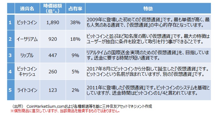 ■取引の多くはサイズの大きい『仮想通貨』に集約されています。例えば、CoinMarketSum.comの2月20日現在のデータによると、最も時価総額が大きいのはビットコインで、全体の38%となっています。続いて、イーサリアムが18%、リップルが9%となっていて、上位5通貨で時価総額全体の72%を占めます。下表は、時価総額上位5通貨とその特徴をまとめたものです。