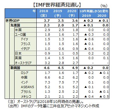 ■『IMF世界経済見通し』によると、2019年の世界成長率は3.5%と、昨年10月時点の見通しから▲0.2ポイント下方修正されました。昨年10月時点でも▲0.2ポイント引き下げられており、2回連続での下方修正となりました。