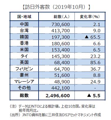 ■一方、10月単月では前年同月比▲5.5%の249万7千人となり、昨年10月の264万1千人を下回る結果となりました。韓国人観光客が昨年10月は57万1千人であったのに対し、この10月は19万7千人となり、前年同月比▲65.5%にまで減少しました。