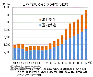■5月21日から22日、東京で第21回国際交流会議「アジアの未来」(日本経済新聞社・日本経済研究センター共催)が開催されました。注目を集めたのは、安倍首相がアジア開発銀行と連携して、今後5年間で約1,100億ドル(約13.2兆円)をアジアのインフラ設備に投じると表明したことです。また、22日、23日に福島県いわき市で開催された太平洋・島サミットでも、首相は今後3年間で550億円以上の財政支援を表明しました。太平洋島しょ国に対して温暖化や災害対策としてのインフラ整備に注力することになります。アベノミクスでは世界の市場開拓戦略として、インフラ輸出を推進しています。成果目標としてはわが国企業の2020年のインフラシステム受注を約30兆円にするとしています(2013年9.26兆円)。