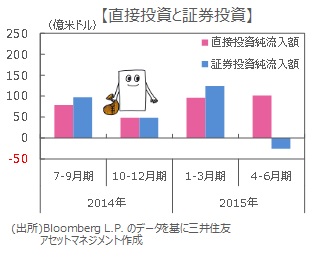 ■2015年4-6月期の「直接投資」純流入額は102億米ドルと、四半期としては過去最大だった前期(96億米ドル)をさらに上回りました。経常収支(貿易やサービスの収支)は62億米ドルの赤字でしたが、「直接投資」の流入で赤字を十分埋められています。