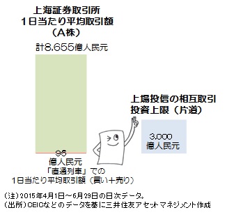 ■先行する株式の「直通列車」の場合、香港市場から上海市場への1日当たりの買いと売りの合計取引額は、上海市場の全体から見ればわずかです。相互取引が上場投信にも拡大することで、中国本土市場が国際的な金融市場となるための準備が徐々に進むと見られます。