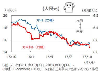 ■10月に入り、「人民元」が対ドルで急落した背景には、ドル高要因と元安要因が考えられます。ドル高のきっかけとなったのは、中国の連休中に、英国の欧州連合(EU)からの離脱が再度懸念された英ポンドが売られ、資金の逃避先としてドルに買いが向かったことです。