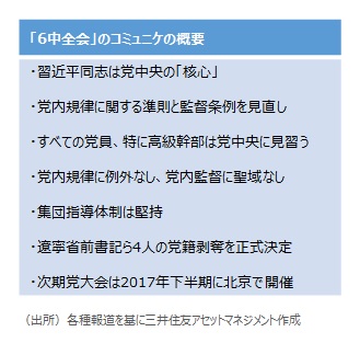 ■「6中全会」を受け、党内で別格の存在であることが示された習氏への権力の一極集中がより鮮明になったと考えられます。更に、習氏は2017年秋の第19期党大会(1中全会)に向けた人事で権力基盤強化を図ると見られます。