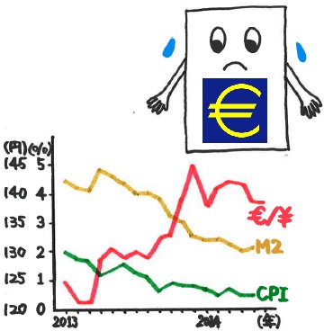 5月の消費者物価指数(CPI、ここでは総合指数)は、ユーロ圏が前年同月比+0.5%、アメリカが同+2.1%、日本が同+1.6%(消費税増税の影響を除く推定値)です。物価は、一国全体で見た場合の、モノとカネのバランスで決まります。カネがモノに対して過剰な場合、モノの価値(物価)が上昇します。これは逆に言うと、カネの価値が下がったことを意味します。物価上昇率が高いほどカネの価値の下落度合いが大きくなり、国際比較した場合、物価上昇率が高い国ほど通貨が弱く、逆に低い国ほど通貨は強くなりやすくなります。