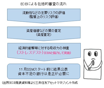 ■ストレステストはユーロ圏の128行(*)を対象に行われ、「資産査定」と合わせて、「包括的審査」と言われます。金融危機後、欧州銀行監督機構(EBA)などがテストを実施しましたが、合格した銀行が破たんし、債務危機に拍車をかけたことなどから、信頼を確立できませんでした。今回はECBがEBAと協力しつつ、初めて行うテストで、SSMの信頼が確立できるかどうかに注目が集まります。