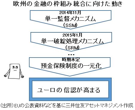 SSMを補完する制度として、SRM(注3)が2015年1月に発足し、2016年から本格的に稼働する予定です。破綻銀行の救済に公的資金を使えば、最終的には納税者の負担となり、経済の活力が削がれます。株主、債券保有者、大口預金者などに一定の負担を求める破綻処理ルールの制定が次のステップとなります。