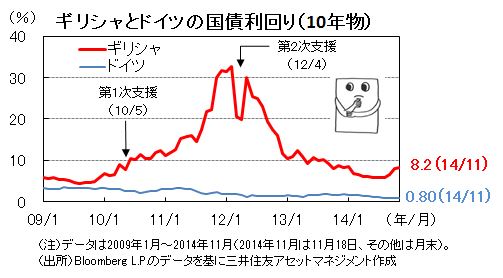 ■ギリシャ国債利回りは、2012年4月に2回目の支援を受けてから低下傾向にありましたが、足元で上昇しています。2015年3月に任期満了に伴う大統領選挙が予定されており、これを巡り緊縮財政に反対する野党が優勢となる観測が強まっているためです。