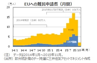 昨年は60万人であった欧州連合(EU)への難民申請者が、今年は11月末で100万人を超えました。特にシリアからの難民が増加し、全体の3割弱を占めました。EUは難民の受け入れに人道的な見地から総じて寛容でしたが、難民が想定を上回る規模となり、10月に受け入れ制限方針に転じました。11月のパリ同時多発テロ犯人の一部が難民に紛れて欧州入りしたことも、受け入れ制限方針を後押ししたと見られます。