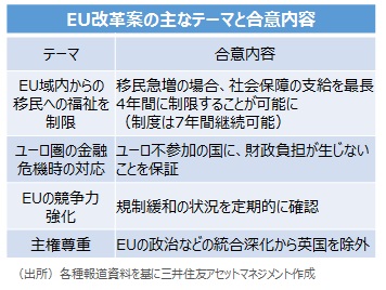 ■これらへの対応として今回の改革案には、最長4年間の域内からの移民への社会保障給付の制限や、ユーロ不参加国はユーロ圏の規制やルールが強制されない規定が盛り込まれました。