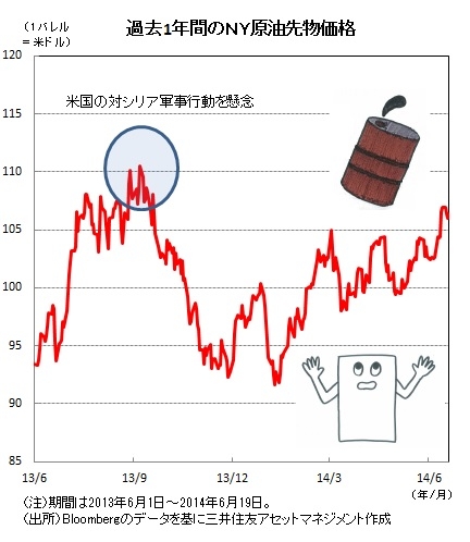13日には、NY市場の原油先物が一時1バレル=107ドル後半と、9カ月ぶりの水準まで上昇しました。近年は複数の要因から、地政学リスクによる原油価格の押し上げの影響が和らいでいますが、要注意です。要因とは、①米国などで非在来型のエネルギー生産が拡大したこと、②先進国で燃費向上車が普及し、ガソリンに余剰感もあること、③米欧が緊急時の備蓄協調放出などの経験を積んだこと、④最大の産油国かつ親米国のサウジアラビアが価格急騰時は増産に踏み切ると見られること、などです。