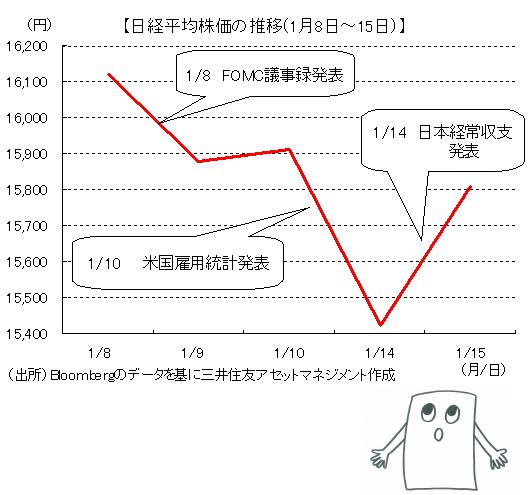 14日の日経平均株価は前日比▲489円66銭の1万5,422円40銭と、大幅に下落しました。10日に発表された米国の12月の雇用統計では、非農業部門雇用者数が前月比+7.4万人と事前の市場予想を大幅に下回る結果でした。雇用者増の減速は一時的との見方が優勢なものの、景気の先行きへの不透明感が強まり米国株は下落、為替も円高となったことから、三連休明けの日本株も大幅に下落しました。