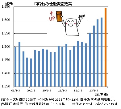 2013年10-12月期末の「家計」の金融資産残高(速報値)は前年同期比+93兆円(同+6%)の1,645兆円となりました。これはリーマンショック前のピークであった2007年4-6月期の1,604兆円、2013年7-9月期の1,609兆円をともに大幅に上回り過去最高金額です。現金・貯金や、保険・年金など各項目が増加していますが、特に株式・出資金の残高が前年同期比+43兆円と大幅に増加したことが貢献しました。また資金循環統計はストック(残高)とフロー(資金流れ)のデータが記載されていますが、株式・出資金残高の増加はフローが▲7兆円(マイナスは売却超過)であったことから、株価の上昇で時価が50兆円増加したためであることがわかります。