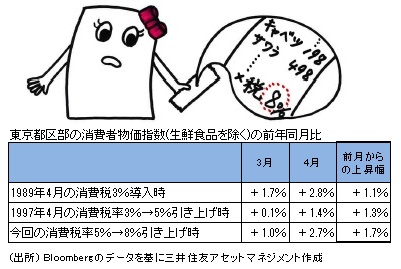 25日に発表された4月の「東京都区部のCPI」(生鮮食品を除く、以下コアCPI)は前年同月比+2.7%と前月の同+1.0%から大幅に上昇しました。前月からの上昇幅は日銀が試算していた消費税増税の影響(1.7ポイント)とほぼ同じになりました。