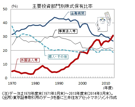 1990年頃から金融機関が持ち合い解消を進めてきたことなどもあり、「外国法人等の保有比率」は上昇傾向が続いていきましたが、2013年度はさらに加速しました。昨年6月の「日本再興戦略」(アベノミクス第3の矢)を機に日本の今後の経済成長への期待が高まったことも一因と思われます。日本人の目から見れば、90年代以降、長らくデフレに苦しみ、成長への期待感が高まらないなか、外国人の目からみれば、日本は先進国の中でも今後の成長に対する魅力が高い国に映ったのかもしれません。