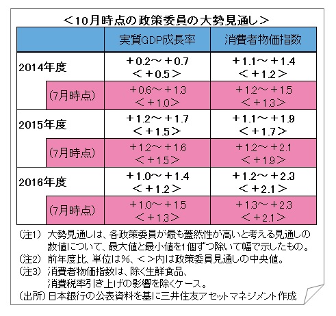 同日の午後に発表された「経済・物価情勢の展望(展望レポート)」で日銀は、2014年度の実質GDP成長率(予想中心値、以下同じ)を7月時点の前年度比+1.0%から同+0.5%へ下方修正しました。2015年度は同+1.5%と前回見通しを据え置きました。