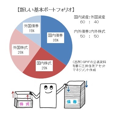 ■新しい「基本ポートフォリオ」では国内債券の割合が従来の60%から35%に大きく減り、内外株式と外国債券の割合が合計で30%増えます。リスク性資産の割合が大きく上昇することになります。その結果、国内資産と外国資産の割合は60%対40%、内外債券と内外株式の割合は50%対50%になります。