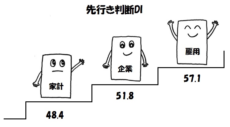 ■2~3カ月先の見通しを示す「先行き判断DI」は前月比+3.3ポイントの50.0ポイントと5カ月ぶりに中立の50ポイントに達しました。家計動向関連は50ポイントに達しませんでしたが、雇用関連は2カ月連続で、企業動向関連は5カ月ぶりに50ポイントを上回りました。