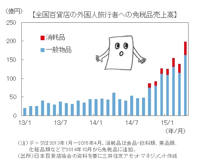 ■4月の外国人旅行者への免税品売上高(昨年10月に新たに免税品となった消耗品を除く)は、前年同月比約2.7倍の約164億円となりました。全体の売上高(店舗数調整前)が13.2%伸びたうち2.5%押し上げた形です。