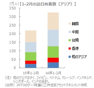 2月は、1月に引き続きアジア地域の旧正月休暇中という要因に加え、航空路線の拡大などで利便性が高まっていることなどが、「外国人旅行者」の増加につながりました。ただ、世界的な株安や円高の進行、中国景気の減速など外部環境は依然不透明で、「外国人旅行者」の増加傾向に対するマイナスの影響が懸念されます。